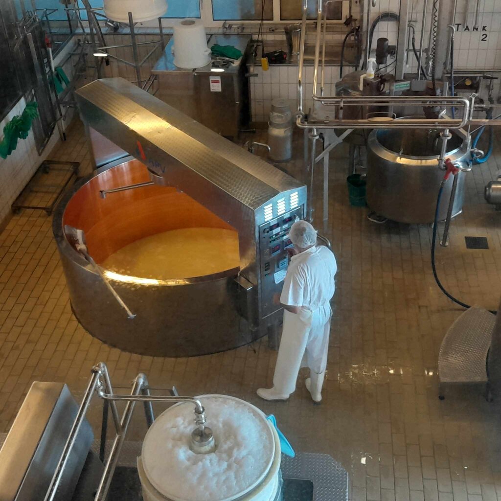 The cheese maker (clad all in white with hairnet and heavy Wellington boots) crisscrossed the floor, switching on paddles which stirred enormous vats of milk, then heating it to the required temperature, adding rennet, discarding whey which accumulated on the surface, and filling the huge steel molds. Time and time again. All day long. As well as hauling in huge cans of milk and carrying them across the floor. How he managed to keep up this pace was astounding, particularly since he wasn’t a young man (or maybe the hard work aged him more than it aged his cheese).