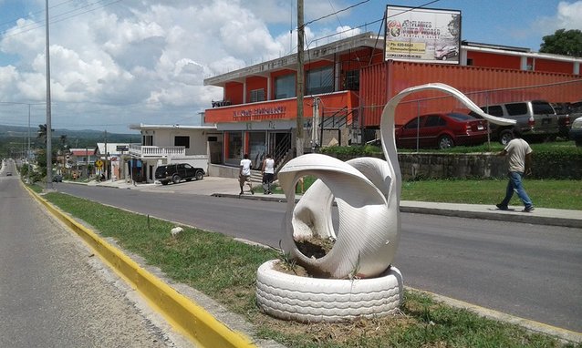 Swan sculpture made from an old tire, painted white. Note the Chinese supermarket in the background
