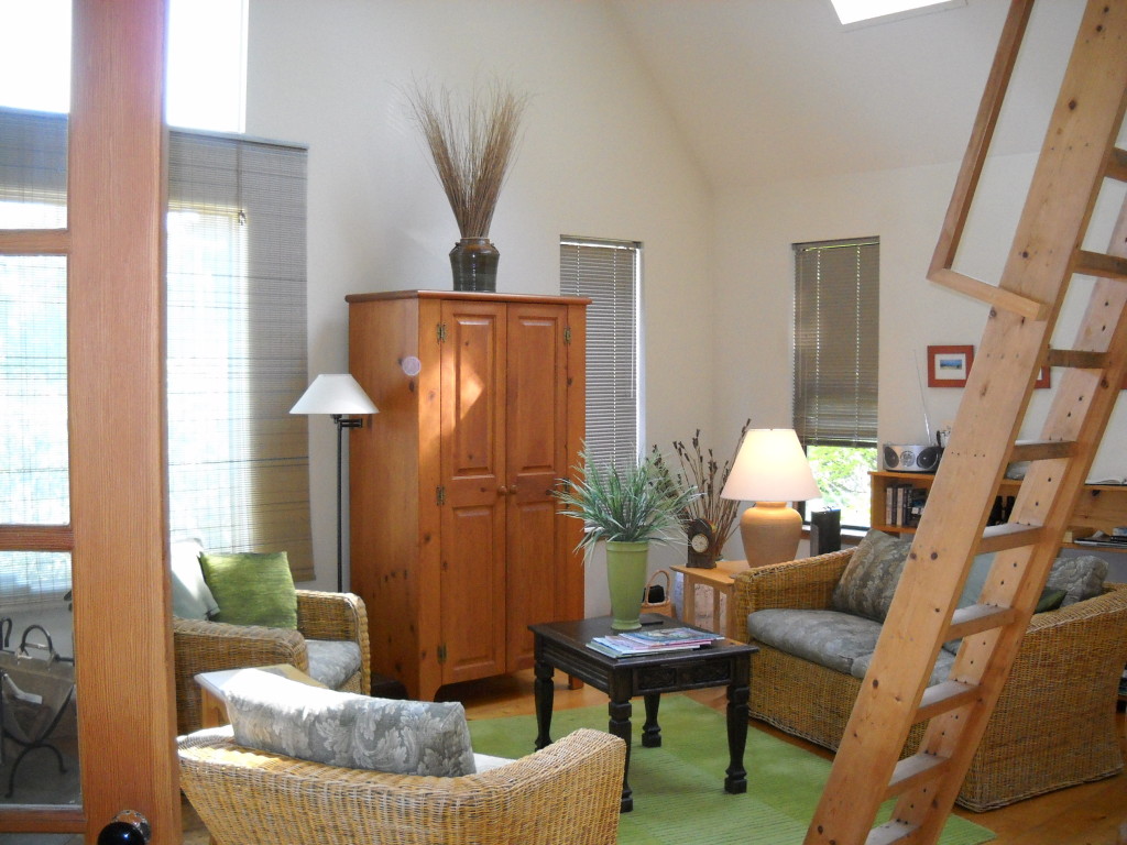 And, while we’re on the subject of beautiful places, I have to say a few words about the guesthouse we chose. The Inn at Skiff Point is one of the loveliest places we’ve ever stayed. We rented the Carriage House which is complete with a bedroom with a little balcony overlooking the Puget Sound, beautifully decorated living room where classical music was playing when we arrived and a wood-burning stove ready for the chilly evening ahead, a kitchen stocked with basic supplies as well as a huge jug of “Pimag” good-for-you water, a bathroom with fluffy white bathrobes, cosmetic supplies and skylights everywhere, giving us views of the verdant gardens and the almost full moon last night.