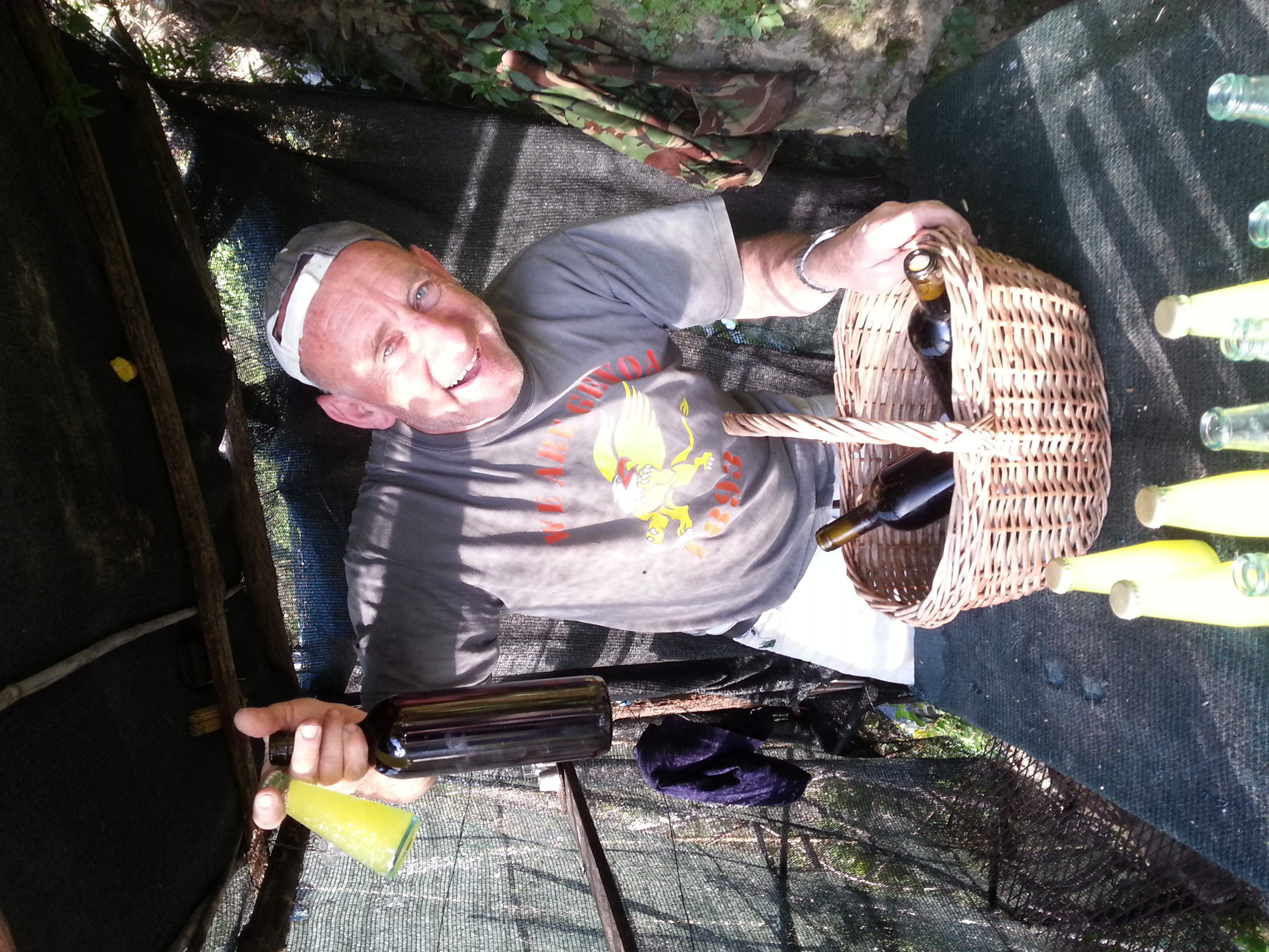 As we made our way along the path, a voice rang out from a nearby patch of vines, and we noticed a tiny hut featuring a table with a few bottles of wine and limoncello. Gianpetro, a 50-something man with brilliant blue eyes, made a dramatic entrance and sold us a bottle of limoncello (five Euros) and wine (eight Euros), demanding that we drink the limoncello on the spot.