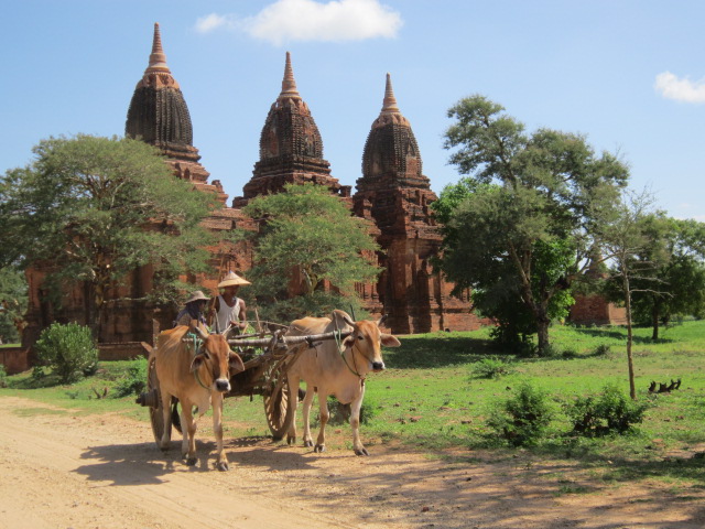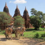 As if clambering around a handful of Bagan’s 3,000 ancient temples wasn’t enough. As if it wasn’t satisfying enough to spend the day in a horse-drawn cart with our guide Min Thu, who explained in great detail Bagan’s extraordinary display of iconic religious and then led us to his home to meet his family, drink some cool water and munch on palm sugar candy. As if being in Myanmar at this extraordinary time in the country’s history wasn’t a poignant enough reminder of how quickly things can change in this complicated world (while we were bumping along Bagan’s rutted roads, Myanmar’s iconic leader Aung San Suu Kyi was in Washington, historically meeting with US President Barack Obama). On this special evening punctuating an extraordinary day, Bagan had one more superlative surprise in store for us as we rolled along to watch the sunset from North Guni temple. A rainbow cloud. Rounding the corner near the Dhamayangyi temple, we spotted a wispy multicolored cloud sprouting from an enormous black cloud bank that hung over the Irawaddy River. “Never have I seen such a thing,” breathed Min Thu, stopping his horse so we could watch the celestial display in silence – and in awe. It stretched to the east – tiny colored fingers reaching into the blue twilight skies. Sunsets over Bagan are legendary. Shades of orange, lavender and yellows have been the subjects of countless travel articles and blogs. But this, a small piece of white cloud, painted with purple, yellow, blue, orange and green? This was different, special. And it morphed before our eyes, the colors becoming more vivid as the streak of cloud reached for the heavens, turned faint and disappeared. Arriving at the North Guni temple for the real show, we climbed up the narrow stairs and sat on one of the temple’s terraces. Before us lay the Irawaddy River; behind it, a mountain range to the west. A monk’s chant forewarned lilting music which wafted across the plains from an enormous nearby monastery where pilgrims were kicking off a week-long festival. The sound echoed off the sides of temples that over the centuries have borne witness to countless festivals as well as cyclones, earthquakes and the respectful curiosity of millions of tourists. Flashes of lightning cast periodic white darts into the hulking black cloud mass that hung over the mountain range. To the north, the brilliant orange glow of a Bagan sunset separated the cloud bank from the horizon as if the sun were reasserting its rightful spot on the evening’s celestial menu. Chattering of birds, gentle music from the monastery and the occasional happy banter of the temple’s only other occupants – a group of intrepid German tourists who had somehow climbed to the temple’s peak – provided the soundtrack to one of the world’s truly humbling panoramas. Small wonder that Bagan is being advanced as a World Heritage Site. Before us stretched kilometer after kilometer of relentlessly flat land dotted with countless temples, pagodas, monasteries and libraries, many of them dating to the 11th to 13th centuries. This is a mystical place of enormous religious significance to this expansive country of intrigue. One guidebook, comparing Bagan to Angkor Wat’s sprawling complex of temples, used a food analogy to make an appropriate distinction. Angkor is like a vast Chinese buffet; Bagan is like tapas, to be taken in small bites and savored incrementally. Like the gorgeous temples of Bagan, Myanmar has a very special flavor. Indigenous people and their traditions are more omnipresent here than many other Asian countries. Shan women and children streak their faces with thanakha, a mustard-yellow paste pounded from an indigenous tree. The stuff is sold everywhere, and a couple of young women painted Gabi before she could protest. Their direct attack sales technique failed miserably. Men and women wear traditional dress. To a westerner’s eye, the men in their floor-length wraparound “pesus” stand out more, but the women in their “longyi” are equally demonstrative of this culture’s commitment to sartorial traditions. Throughout the Bagan region, paying reverence to the temples is as woven into the culture as is the importance of tourism dollars – Min Thu tells us that 80% of the 1,000 people in his village make their livings from tourism. There are strict development and visitation regulations and signs direct visitors to leave their shoes behind when entering the temples. In some places, “ladies prohibited” signs speak to the fact that some traditions refuse to die in the face of modern trends. Later, we paused to watch a progression of novice monks walking single file through Min Thu’s village collecting alms and the last meal of the day. Since novices and monks are prohibited from eating after noon the morning’s two meals have extra significance. The novices stop at Min Thu’s aunt’s house for a sweet bean rice cake snack, each accepting a cake in their alms bowl before returning to the dusty street. There are extra cakes, and we get to sample one as Min Thu explains the home’s architecture, history and construction. I ask Min Thu to tell his aunt that she has a beautiful smile. He does, she beams, and he says she will probably float away on the breeze from the compliment. Like countless others, this village flourishes in an intricate weave of relationships and cooperation. Food, security, family, safety – all are community concerns, tended to carefully like the water which is pumped every morning from the Irawaddy into enormous holding tanks at the village’s center. Women collect water for their homes twice a day – morning and night – and we see several of them making their way along a dusty street with two-gallon buckets balanced on their heads. Life is simple here, isolated but reliant on the outside for the lifeblood of money. The ebb and flow of tourism –coupled with an occasional natural disaster such as the 1975