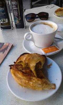 The perfect breakfast: two pastizzi (one cheese, one pea), and a yummy cappuccino.