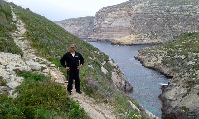 Yours truly during a lengthy hike in Xlendi Bay overlooking the massive limestone cliffs and the cobalt waters of the Mediterranean