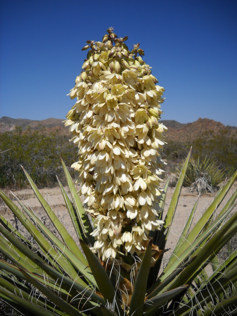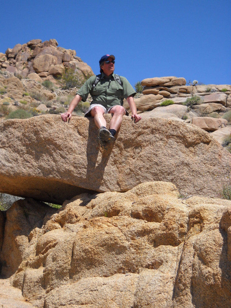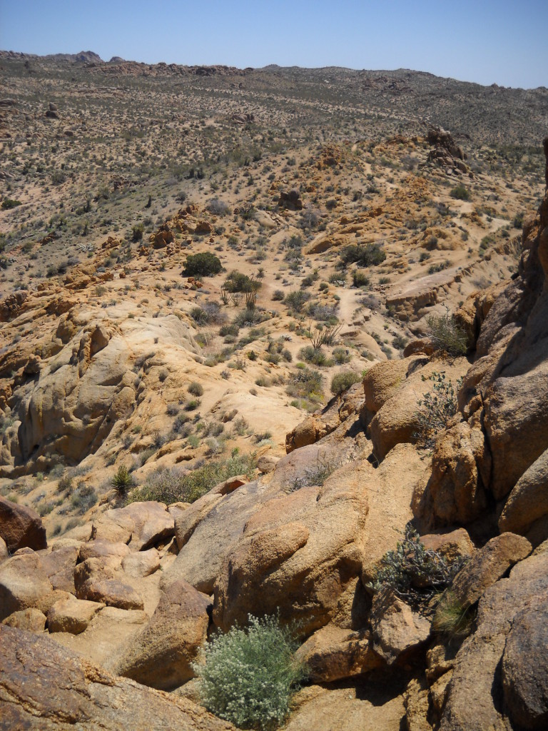 We pause for a couple hours to hike to Mastadon Peak, a soaring stand of rock that affords those who climb it (I made it up two-thirds of the way before the freelance climb’s challenges made me reconsider whether to continue), drinking in the desert’s beauty against the clear blue sky. We later hear that an usually wet spring has caused an equally rare explosion of desert flowers, and the land before us is living testimony to this natural fact.