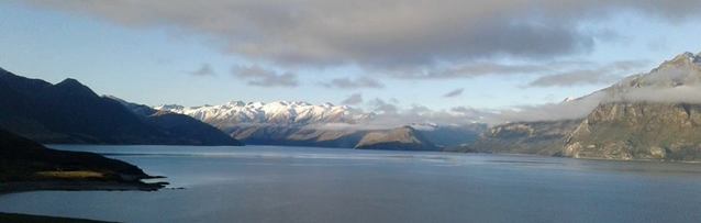 Snow-crested mountains back the calm, cold waters of Lake Hawea near Wanaka on New Zealand’s South Island